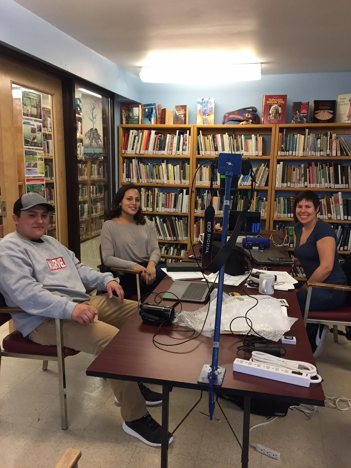 Today we workshopped in the Library on the Kahawake Reserve with Concordia Students: Courtney (yup another Courtney) and Brooke ! I have to say we laughed A LOT. And seems like we may have way more than 2 films in these two enthusiastic students! We brainstormed today, watched film examples and Brooke even ended up interviewing her Tota (Grandmother) and capturing some video!